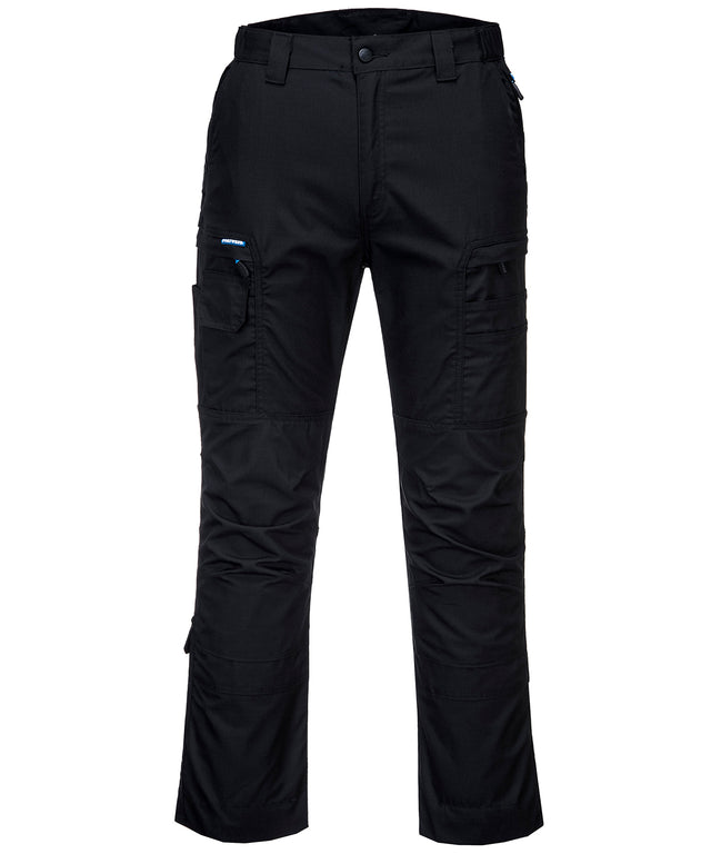 Contemporary work trouser made from highly durable ripstop fabric that stretches as you move. Subtle articulation on the knees allow for increased freedom of movement and a high rise back waistband ensures protection in all working positions. Packed with functionality including pre-bent knees a crotch gusset two tier knee pad pockets and an adjustable leg length for added convenience. Multi-functional thigh pockets provide secure storage of phones pens and tools.