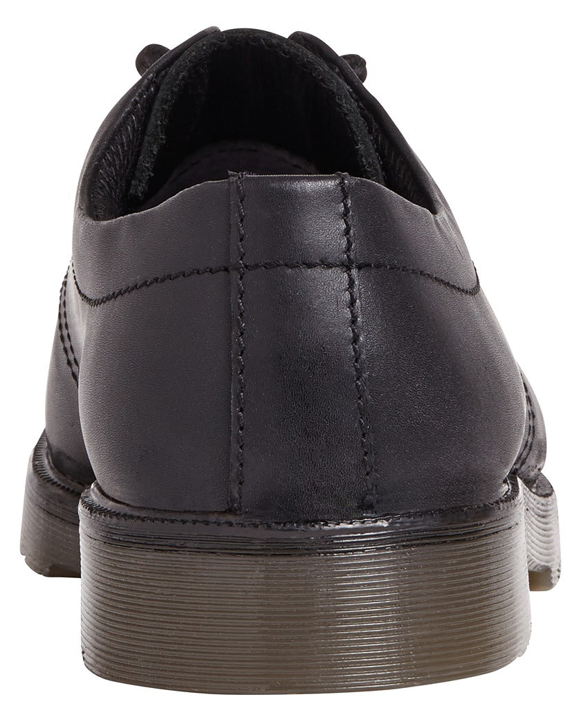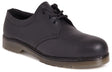 Black smooth leather safety shoe. Padded collar for added comfort. Steel toe cap protection. Moisture wicking inner lining. PVC air cushion outsole. A lightweight uniform safety shoe for lighter duties, factory or warehouse tye work.