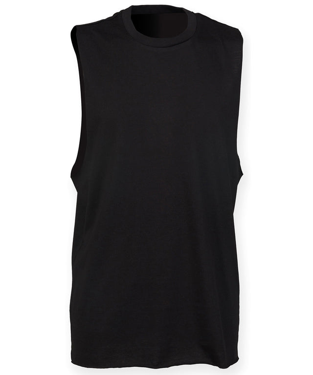 Fashion meets athleisure. Style and freedom to move with a stretchy ribbed crew neck and raw edge slash armholes and hem. Features tear-out label for easy rebranding.